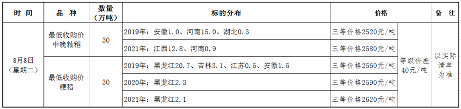 8月8日最低收购价稻谷竞价销售交易公告